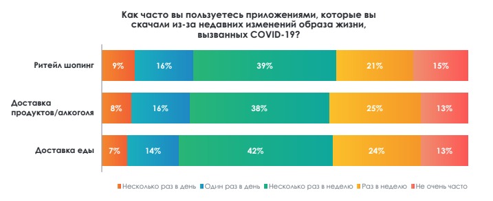 Изменение потребительских привычек повлияло и на использование специализированных мобильных приложений. В период самоизоляции в топ-3 самых востребованных попали доставка еды (36%), социальные сети (33%) и ритейл шоппинг (33%). Для сравнения: до начала пандемии наибольшей популярностью пользовались сервисы по контролю финансов (свыше 60%), ритейл шоппингу (57%) и каршерингу (55%). Интересно, что и старшая возрастная категория, которая отличается достаточным консерватизмом в отношении использования цифровых продуктов, также начала обращаться к этому каналу общения.