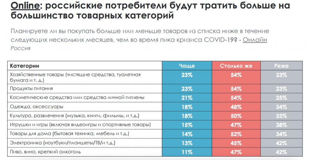 Новые привычки, выработанные во время пандемии, повлияют на продажи в определенных товарных категориях. Ожидается, что 57% респондентов будут проводить больше времени дома, где будут работать (40%), готовить (52%), заниматься спортом (35%) и садоводством (23%).