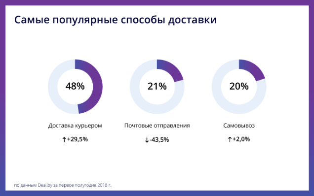 Самый интересный вывод отчета: популярность курьерских компаний сейчас находится на небывалой высоте. Впервые самым популярным способом доставки стала доставка курьером.