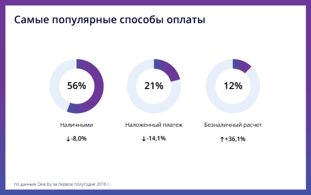 А вот по безналичному расчету платят все чаще. В первом полугодии этого года белорусы оплатили онлайн 12% покупок на Deal.by, что на 36% больше, чем годом раньше. Как говорят эксперты, рост числа безналичных расчетов - позитивный сигнал для рынка, означающий, что покупатели стали больше доверять интернет-магазинам.