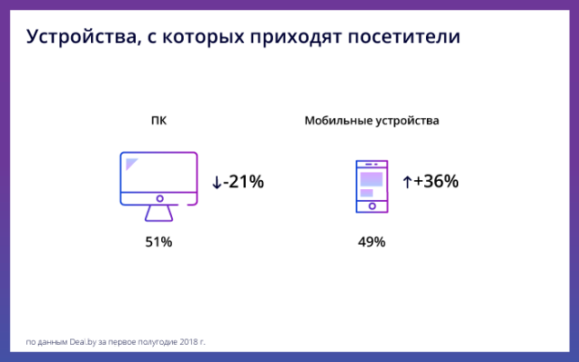 Сейчас для покупок в онлайне белорусские пользователи сети одинаково часто пользуются компьютерами и мобильными устройствами. Как говорят эксперты, в первом полугодии 2018 года 51% посещений Deal.by пришлось на компьютеры и 49% на мобильные устройства.