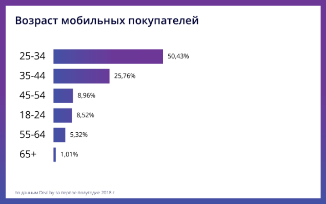 Чаще других со смартфонов и планшетов покупают белорусы в возрасте 25-34 лет. За ними следуют покупатели в возрасте 35-44, следующие - те, кому 45-54.