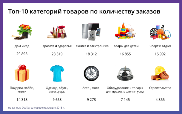 Первые 6 месяцев 2018 года показали, что сейчас белорусы чаще всего покупают в интернете товары для дома и сада, товары для красоты и здоровья и технику и электронику. Также в топе - товары для детей, товары для спорта и отдыха и подарки. В сравнении с прошлым годом потребители стали на 70% реже покупать товары для строительства.