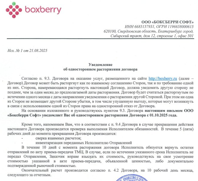 Уходит эпоха. Оператор логистических услуг Boxberry официально уведомил партнеров о полном прекращении деятельности своей сети пунктов выдачи заказов (ПВЗ) по всей России с 1 октября 2025 года. Решение о расторжении договоров в одностороннем порядке было направлено клиентам по электронной почте после публикации уведомления в личных кабинетах 26 августа.