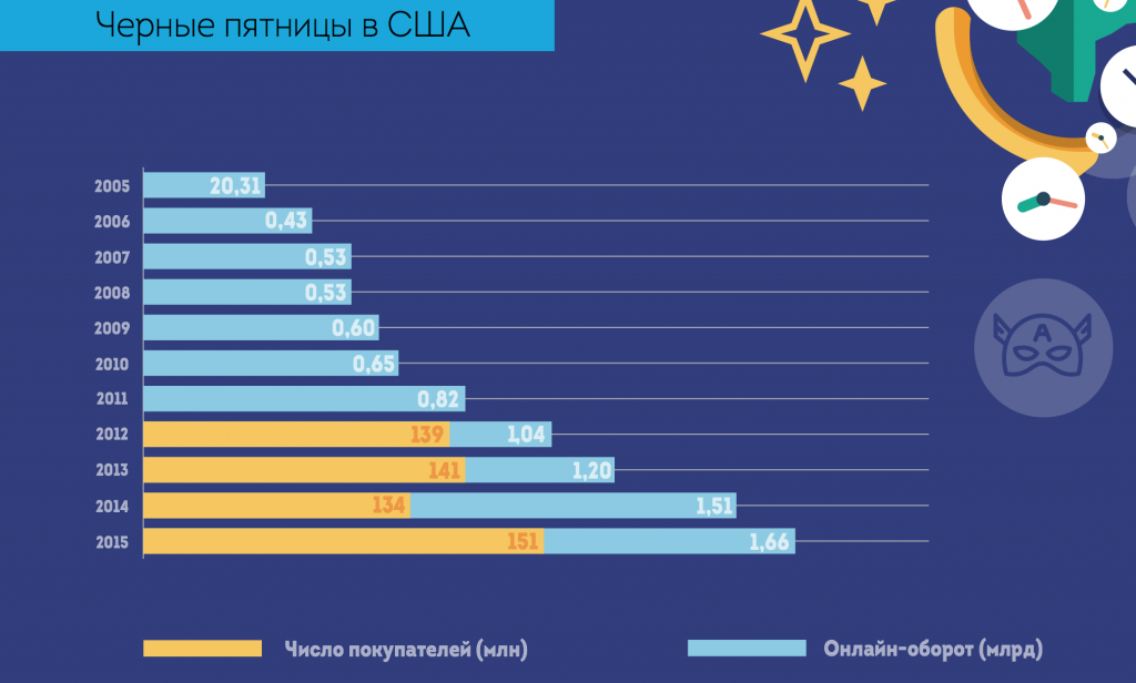 - Прошлогодняя Черная Пятница побила все предыдущие рекорды в истории проведения акции: в 2015 году число покупателей достигло 151 млн человек, а суммарный онлайн-оборот оценили почти в $1,7 млрд.