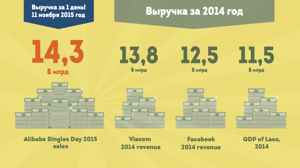 - Больше всех 11 ноября 2015 года удалось заработать Alibaba. Объем онлайн-продаж в День холостяка составил $14,3 млрд. Для сравнения: выручка Facebook за 2014 год равна всего $12,5 млрд.