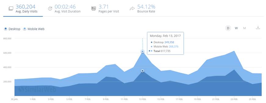 Главный аналитик Price.ru & Begun и топ-эксперт ИРИ Алексей Петровский: Активность посещаемости на сайты продаж подарков на 13 и 23 февраля вырастает в 2.5 раза от среднесуточных значений; при этом годовые показатели в 2017 году за эти даты выросли в среднем на 30%.