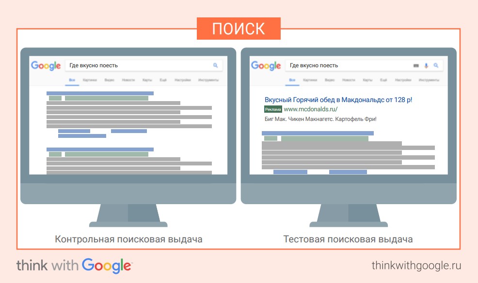 Компании провели тестирование двух групп респондентов (всего 400 человек). Испытуемым предлагалось выполнить поиск по общему запросу "Где вкусно поесть". Респонденты, входящие в экспериментальную группу, видели поисковую выдачу с рекламой бренда, а во контрольную - без нее.
