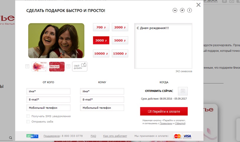 Персонализация подарка лучше всего реализована у бренда «Бюстье» - можно написать личное поздравление и не просто выбрать дизайн карты из списка предложенных, а загрузить собственную фотографию. По статистике Digift, около 30 % отправителей электронных подарочных карт пользуются данной опцией. Чем больше возможностей персонализации, тем более личным становится подарок, даже электронный.