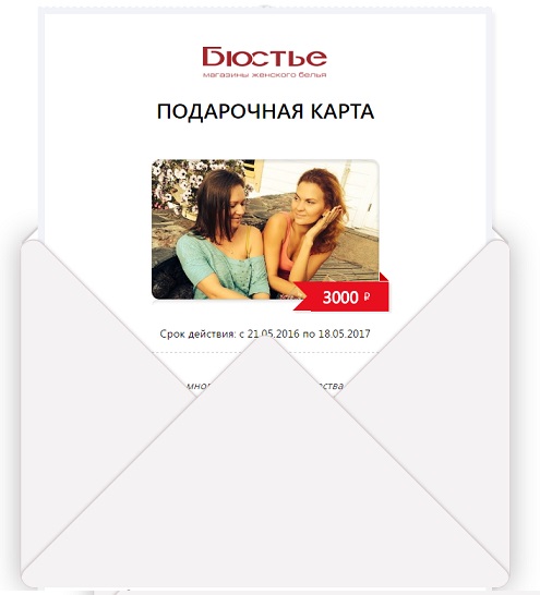 Электронный подарочный сертификат - это подарок. Чем более празднично он оформлен, тем лучше он воспринимается. Например, у «Бюстье» карта появляется из анимированного конверта. Если есть желание вручить подарок лично, сертификат можно распечатать и сложить как открытку.