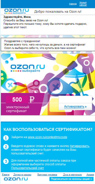 У других брендов карта чаще всего приходит в виде изображения в теле письма, которое нельзя распечатать («Озон», Name’s), или вложенным файлом, готовым для печати (например, Incanto или «Детский мир»).
