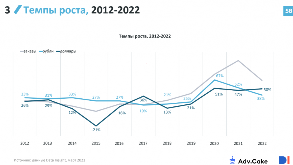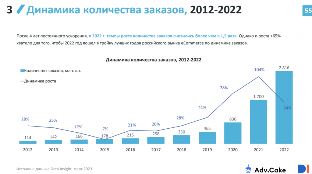 2022 год вошел в тройку лучших годов российского рынка eCommerce по динамике числа заказов. Роста количества заказов составил 65% при этом объем рынка в рублях вырос на 38%.
