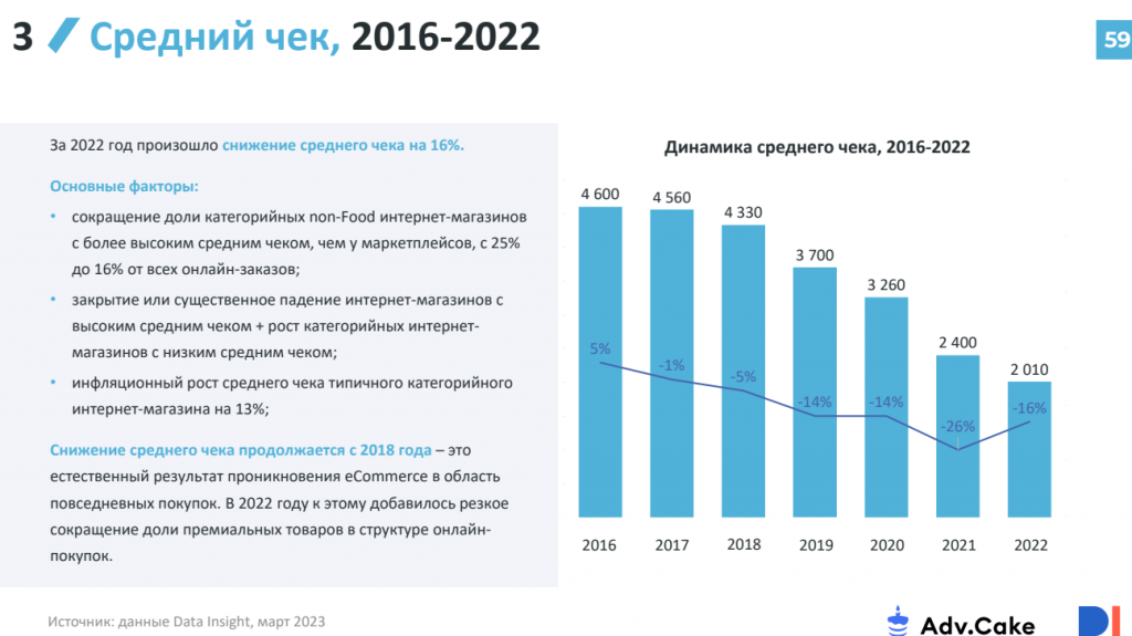 Средний чек продолжает снижаться: по итогам 2022 года он составил 2 010 рублей, это на 16% ниже прошлогодних показателей. Причина снижения среднего чека - увеличение доли магазинов с небольшими чеками и частыми заказами (маркетплейсы, ультрабыстрая доставка продуктов). При этом в большинстве магазинов средние чеки выросли за год.