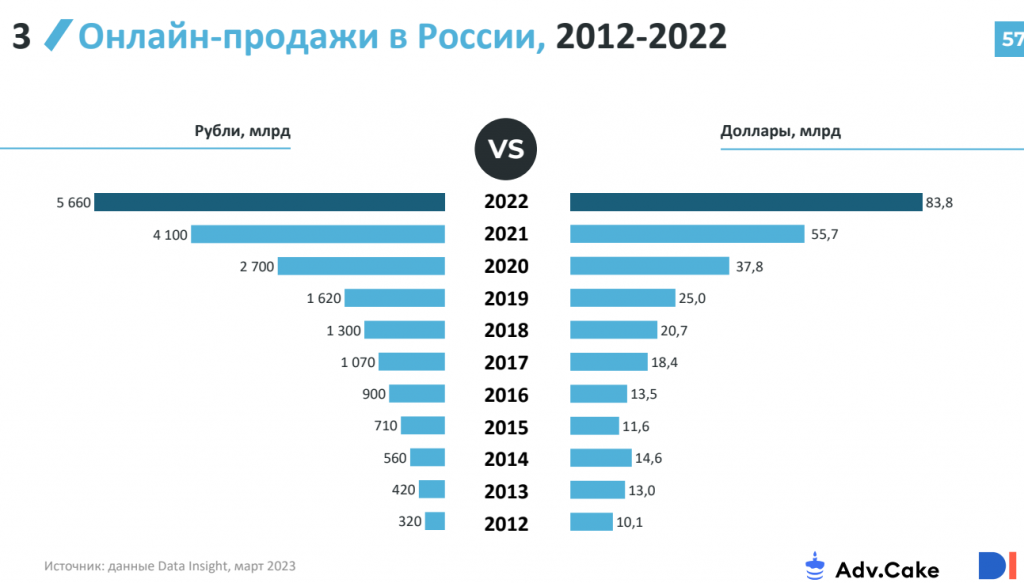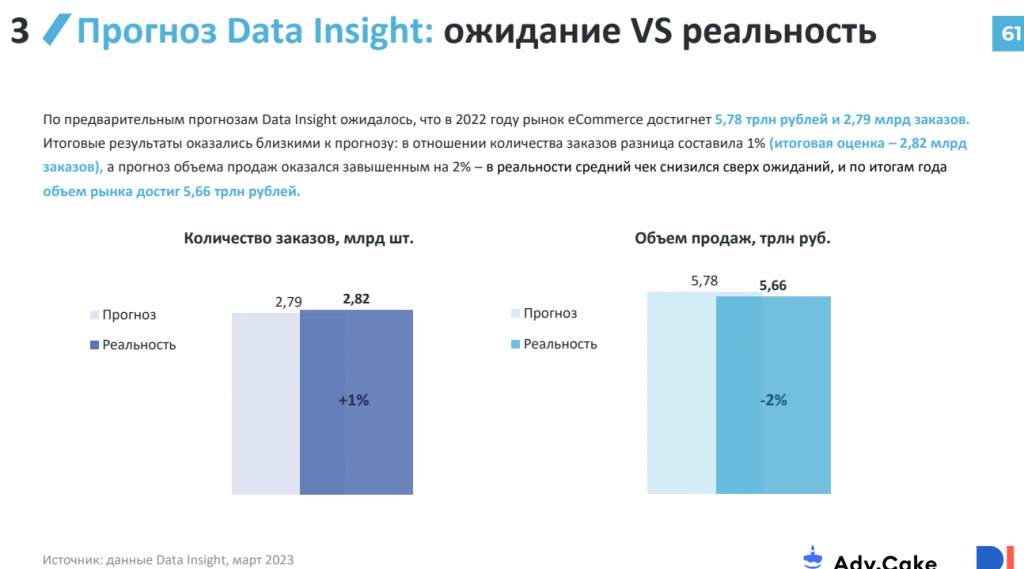 По прогнозу Data Insight, в 2023 году объем продаж на российском рынке eCommerce достигнет 7,4 трлн рублей, рост составит 30%. Количество выполненных заказов на рынке eCommerce достигнет 4,6 млрд (+64%). Темпы роста в текущем году продолжат замедляться - но показатели роста все равно останутся на уровне намного выше среднемирового.