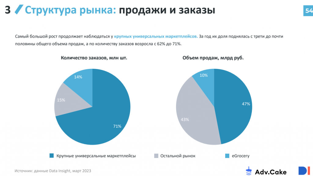 Основной рост в 2022 году обеспечили крупные универсальные маркетплейсы: во второй половине 2022 года их доля достигла 73% в общем количестве заказов и впервые превысила половину всего объема продаж. Они же обеспечат основной рост в 2023 году.