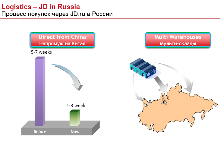 Виктор Сюй, президент международной бизнес-группы JD.com, ранее отметил в Facebook: "К ноябрю уже сделаем доставку лучших китайских и российских электронных товаров и других лучших товаров прямо из европейских таможенных складов со сроком до одной недели для европейской части России и до двух недель для азиатской части. Возможно и 3 дня для самой быстрой доставки".