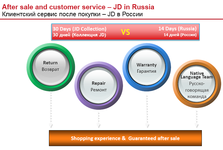 От ряда заводов производителей JD.com, по словам Никко Чэня, получил авторизацию, согласно которой компания сможет предоставлять на территории России ремонт, гарантию и возврат гаджетов. А для товаров JD Collection срок возврата увеличен с 14 дней, положенных по закону, до 30 дней.