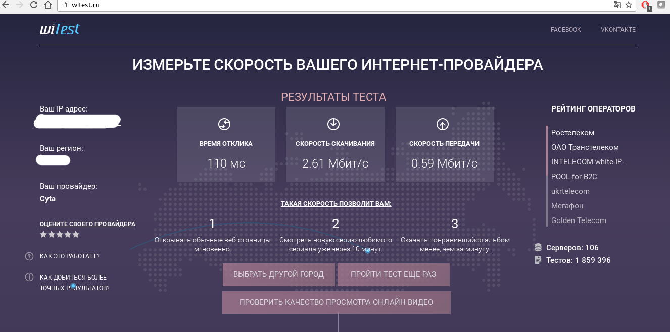 Для максимально точного результата рекомендуется на время теста отключить программы для скачивания файлов, email-клиенты, мессенджеры, соцсети и другие программы, которые используют интернет-трафик. После этого заходим на сайт witest.ru с «рабочего» интернета, нажимаем кнопку «Начать тест» и ждем результаты. В идеале лучше повторить тест несколько раз и сравнить полученные данные.