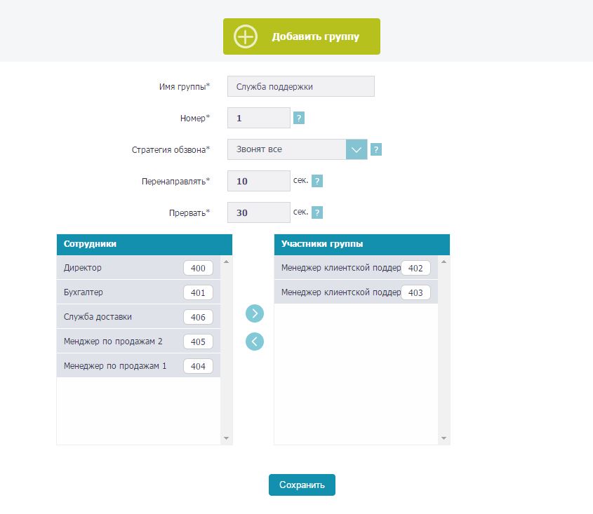 Если Вы не хотите, чтобы все звонки поступали сразу на все телефоны, объедините сотрудников одного отдела в группы. Каждая группа соответствует отделу, в котором работает сотрудник, тем самым, звонок в отдел продаж, будет приходить только в отдел продаж, а не куда – то еще. В группе нужно настроить логику, по которой звонок будет доходить до нужного вам сотрудника.