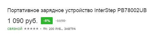 «Выставочная» скидка «Эльдорадо» - на портативное зарядное устройство InterStep PB78002UB. Его в компании можно купить по цене в 1 799 рублей, однако те, кто догадается ввести код "КИБЕР40", получают скиду в 40%. Если код не ввести, то цена остается стандартной. (От редакции: интересно, а какой процент пользователей попадаются в такую ловушку магазинов и не вводят код). Акционная цена - 1079 рублей.
