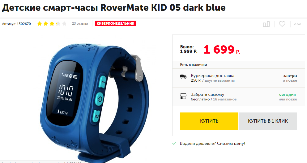 Иногда можно вживую наблюдать за тем, как крупные компании устраивают своего рода «дуэль скидок». E96, организатор одного из крупных российских «Киберпонедельников», сделал целую страницу под свои предложения. Первый товар в списке – умные часы RoverMate Kid 05. Скидка в 27%, цена 2 190 рублей.