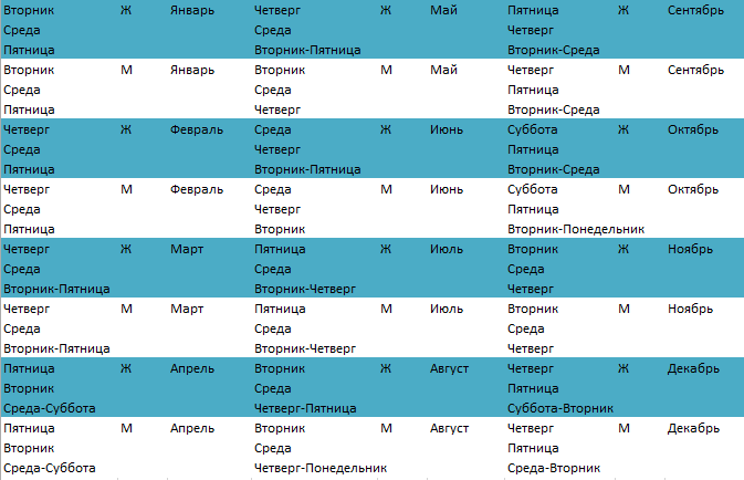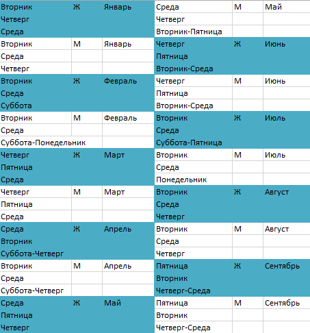 - Январь : вторник, пятница, четверг
