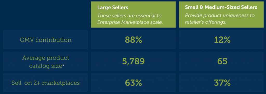 Крупные продавцы продолжают играть важнейшую роль на маркетплейсах. На их долю пришлось 88% валовой стоимости товаров на крупнейших мировых торговых площадках в течение первого квартала этого года. Но число и активность мелких и средних продавцов растет: они удвоили свой вклад в общий объём продаж за тот же период, а за год их показатели утроились.