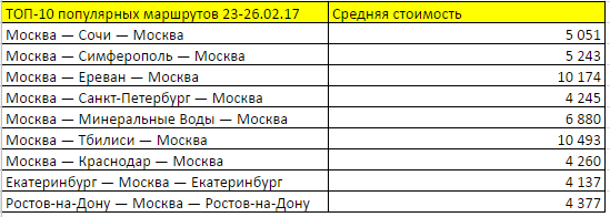 «Самыми популярными направлениями на День защитника Отечества среди путешественников из России стали Сочи, Москва, Санкт-Петербург, Прага и Симферополь. Также в Топ-10 вошли Минеральные Воды, Ереван, Калининград, Рим и Милан», - рассказывает Хаванский.