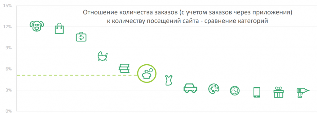Конверсия сектора составляет 5,1% (5,1 заказа на 100 посещений). Это чуть больше, чем у онлайн-магазинов одежды, обуви и аксессуаров.