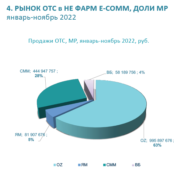 Однозначным лидером среди маркетплейсов в сегменте ОТС остаётся Ozon, который проводит около 63% продаж. При этом в последнее время СберМегаМаркет активно теснит конкурента. Данные не учитывают сумму продаж лекарственных средств (FBS площадки Яндекс Маркета, которые доставляются в точки выдачи аптеки) по системе по системе дропшиппинг.