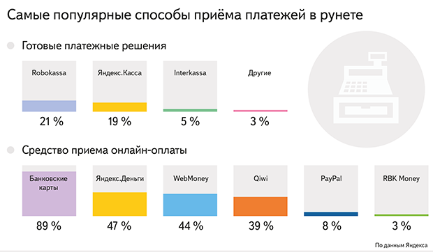 Специалисты Яндекса изучили, с помощью каких платёжных решений и какими способами принимают средства российские интернет-магазины.