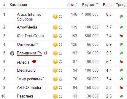 Первое место в рейтинге агентств контекстной рекламы заняла компания Artics Internet Solutions. Топ-10 представлен следующим образом: