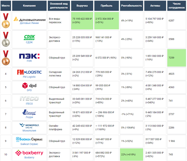 На первом месте оказалась компания Деловые Линии. Компания вернула себе место в ТОП1, утерянное в 2022 году. Отмечается значительный рост выручки, чистой прибыли (компания также ТОП1 по абсолютным показателям) и чистых активов.