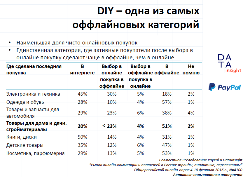 DIY - это сегмент, в котором больше, чем где бы то ни было, побеждает модель, когда у вас есть и онлайн и офлайн-магазины, и они неразрывно связаны между собой. "Чистый онлайн, похоже, проживет не очень долго. Чистый офлайн проживет дольше, но тоже ограниченное время. Смесь онлайна и офлайна будет разной в разных товарных категориях, т.к. а разных категориях у людей разное товарное поведение. Причем поведение различается иногда диаметрально", - считает эксперт.