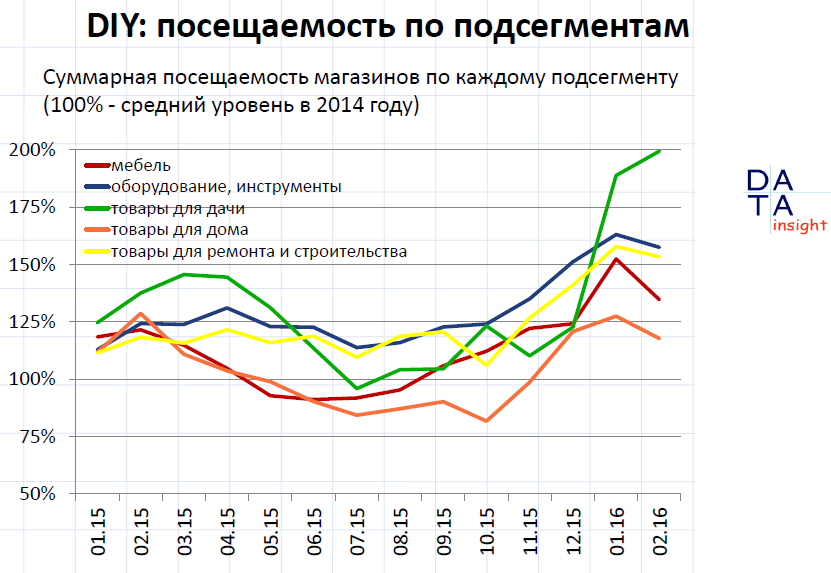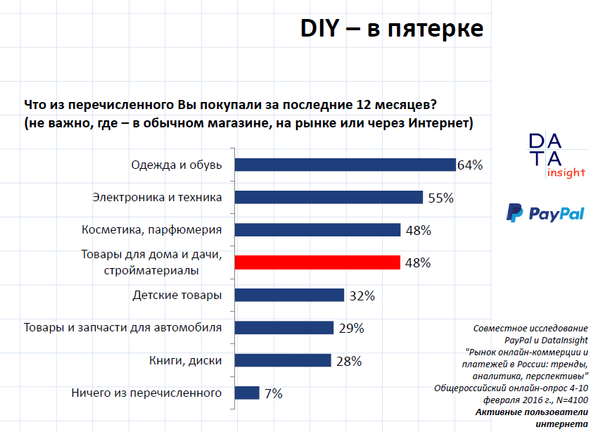 Рынок DIY в 2015-2016 годах находится на взлёте. «За прошлый год мы увидели 55 миллиардов рублей оборота в онлайне. Это 8% от всего внутрироссийского рынка eCommerce или 4% по количеству всех заказов в онлайне», - сообщил Федор Вирин, представляя отчет исследования агентства Data Insight на II ежегодной прикладной конференции «DIY. Do it online». При этом эксперты считали только те сделки, которые были именно инициированы в онлайне. Не важно, где покупатель оплатил свой товар, важно, что заказал в интернете. В этот список не попали люди, которые выбирают товар в онлайне и покупают в традиционном магазине.