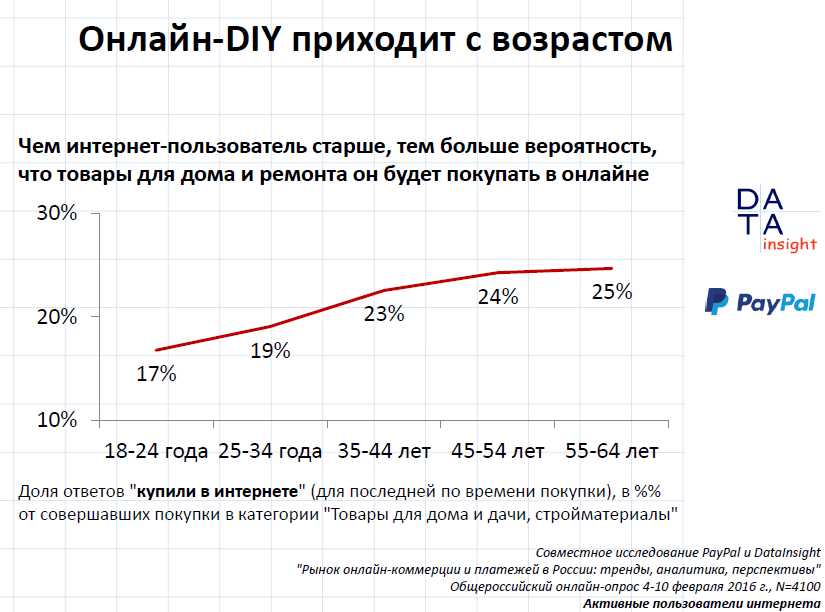 Ещё один интересный тренд: чем старше вы становимся, тем больше мы покупаем DIY в онлайне. "Это уникально, во всех других категориях ровно наоборот. В остальных категориях люди 25-34 совершуют онлайн больше покупок, чем пожилые люди. Видимо, мы больше озабочены ремонтом во взрослом возрасте, чем в юном", - считает эксперт.