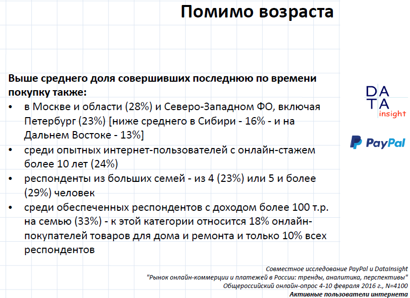 Кроме возраста на число покупок в интернете влияет регион, в котором живёт покупатель, его опыт и так далее.