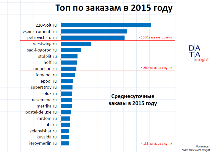 Результаты "Топа по заказам в 2015 году" показывает то, что магазинам есть ещё куда расти. Всего три магазина имеют больше 1000 заказов в сутки.