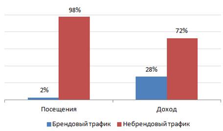 Количество брендового трафика с органической выдачи поисковых систем не зависит от действий SEO-специалиста, т. к. в большинстве случаев ваш сайт будет естественным образом выходить на первые позиции по запросам, содержащим название бренда. Кроме того, при проведении различных PR и офлайновых рекламных кампаний брендовый трафик из поиска резко возрастает.
