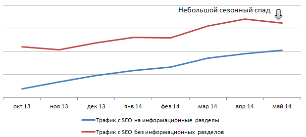 С августа 2013 г. началось активное наполнение информационных разделов со статьями и справочником для абонентов. В итоге, к маю 2014 г. была следующая статистика по трафику с SEO*: