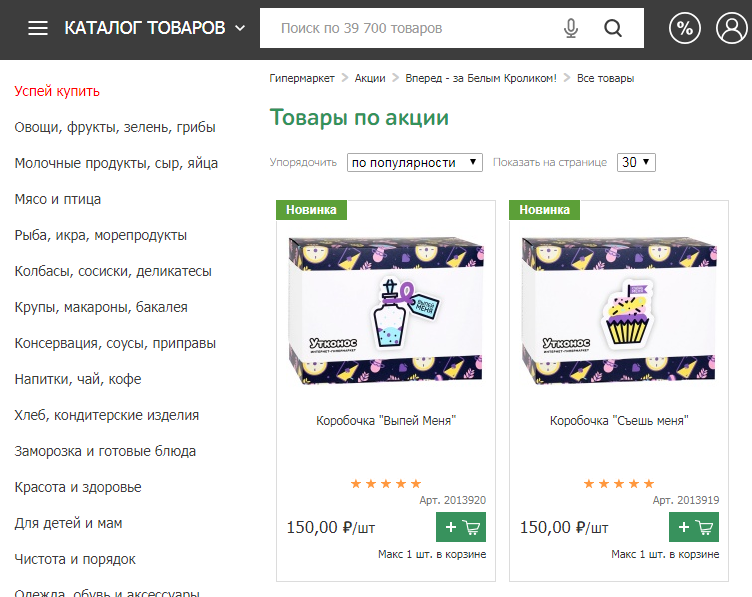 Кроме этого магазин проводит интересную маркетинговую компанию. Если вместо продуктов и других товаров произнести две волшебные фразы из произведения Льюиса Кэрролла: "Съешь меня" три раза или "Я хочу убить время", то сработает функция "следовать за белым кроликом" и вы автоматически попадете в тематический раздел на сайте магазина.