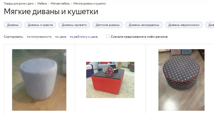 Пуфики, кресла «лежали на полке», которая в Яндекс.Маркет называется «Мягкие диваны и кушетки». И не просто лежали – превращались в залежалый товар, потому что Яндекс.Маркет их не показывал в выдаче или показывал не в той категории. Чтобы решить проблему, мы рекомендовали прописать однозначные названия родительских категорий и категорий следующих уровней.