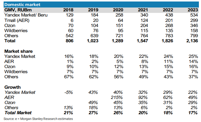 В Morgan Stanley оценивают долю Wildberries от всего внутрироссийского рынка eCommerce (GMV) в 7% и не предполагают, что 2023 году она поменяется. В самой компании говорят, что, с учетом текущей динамики, уже к концу 2018 года сумеют побороться за 14%.