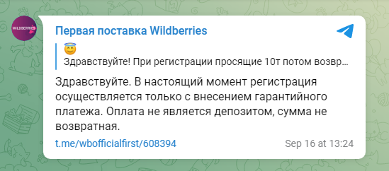 Судя по тому, что говорят администраторы канала "Первая поставка" (канал для новых продавцов), оплата не является депозитом, сумма не возвратная.