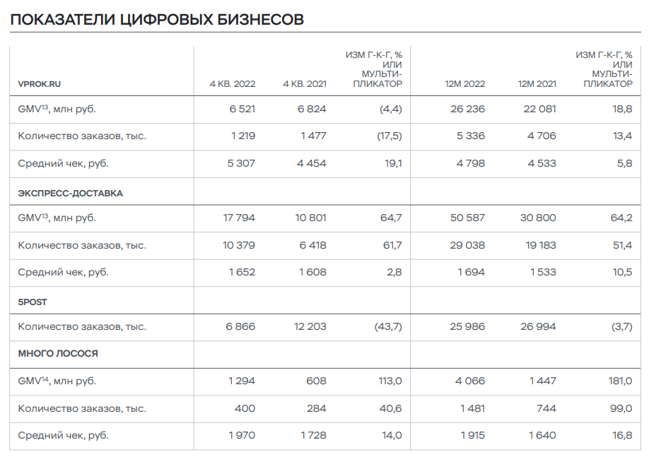 Зато выручка цифровых бизнесов за 4 квартал увеличилась на 35,8% гк-г в 4 кв. 2022 г. и внесла вклад в размере 0,6 п.п. в рост квартальной консолидированной выручки на уровне 16,3%. Количество заказов Vprok.ru и сервиса экспресс-доставки в день достигало 235 тысяч в пиковые дни декабря, рост на 73% г-к-г.