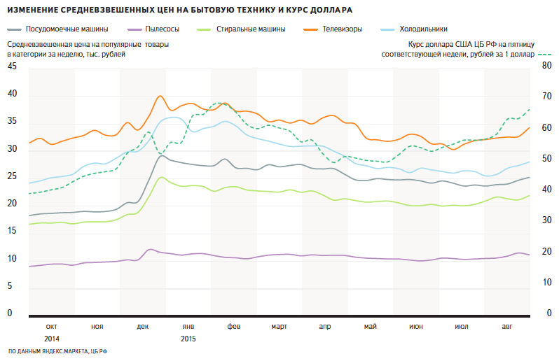 По данным Яндекс.Маркета, средняя цена на популярные модели холодильников в интернет-магазинах выросла с начала июня по 23 августа на 7%, стиральные машины подорожали на 9%, пылесосы — на 10%. Курс доллара за тот же период вырос более чем на 20%.