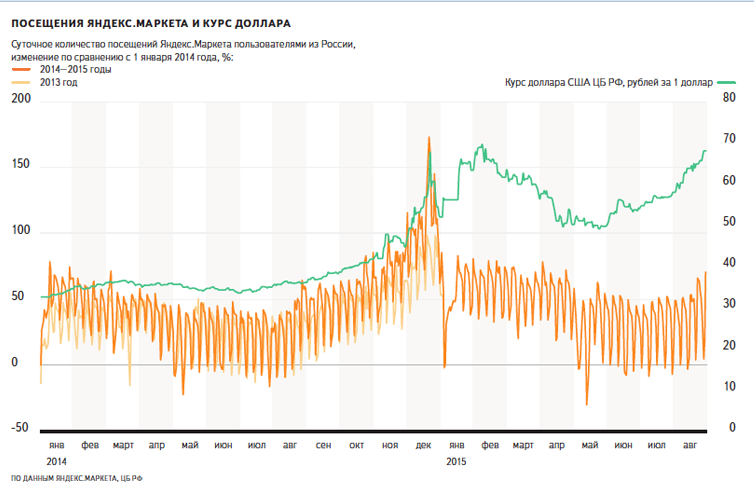Российский e-commerce вырос в первой половине 2015 на 28% в основном за счет инфляции (согласно недавним данным от Data Insight). Тем временем, Яндекс.Маркет фиксирует в новом исследовании медленный плавный рост цен на товары в интернет-магазинах и сравнивает его с ростом курса доллара.