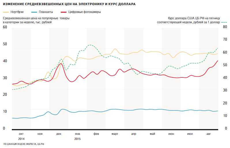 Электроника — ноутбуки, планшеты, мобильные телефоны — летом не подорожала (после роста в декабре 2014 года). Цифровые фотокамеры после декабрьского всплеска подешевели, однако за лето снова успели вырасти в цене и сейчас стоят даже больше, чем в конце 2014 года.