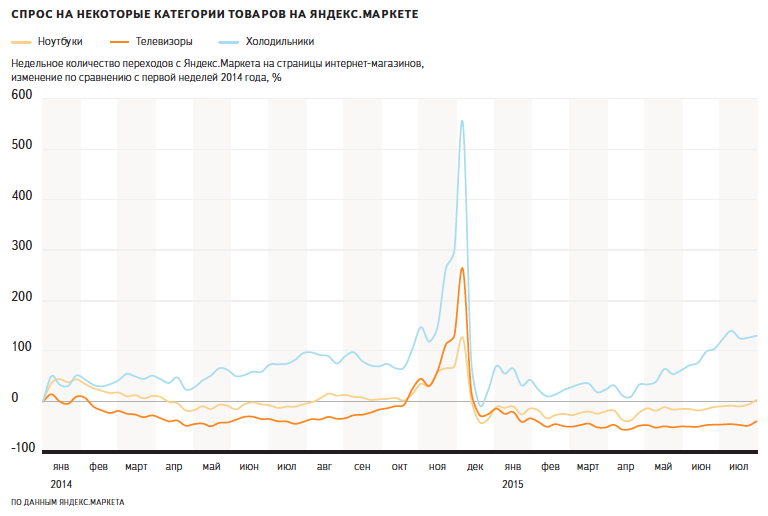 Сейчас рубль упал даже сильнее, чем в конце 2014 года, но нынешняя ситуация на рынке заметно отличается от декабрьской. Если в ноябре-декабре прошлого года резкое падение курса рубля совпало с предновогодним ажиотажем и привело к существенному росту спроса и заметному скачку цен во многих товарных категориях, то сейчас спрос на технику и электронику растёт гораздо медленнее, чем в декабре.