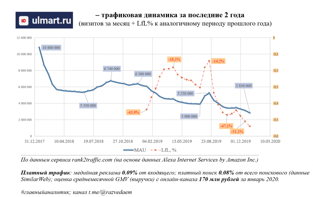 Главный аналитик Price.ru Алексей Петровский отмечает, что, если судить по статистике трафика сайта интернет-магазина, с августа 2019 года дела в компании обстоят очень плохо.